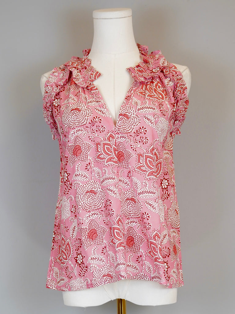The Butterfly Top in a cute block print, pink and red, 100% cotton. Pairs perfectly with our Jaipur Maxi Skirt in the same print.