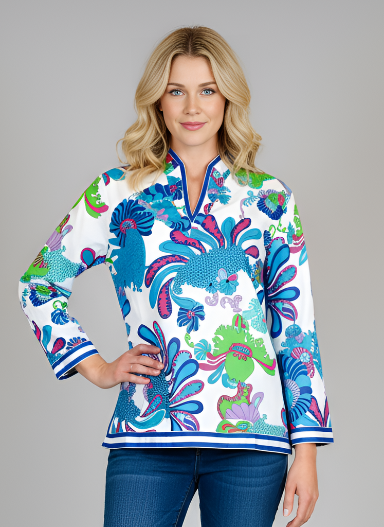 Carolyn Tunic Top - Mod Floral in White and Blue Multi