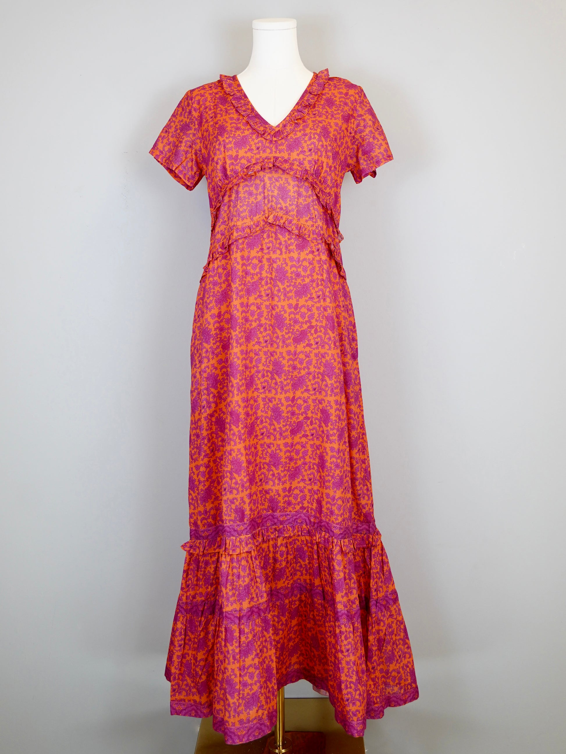 Delicate floral print on 100% cotton voile, lined. Pockets, as usual. Maxi length (our maxi isn’t too toooo long…it hits most at the ankle or slightly above…no skirt dragging here!). V-neck, short sleeves. Easy. Pretty. Amazing Print. All the things.