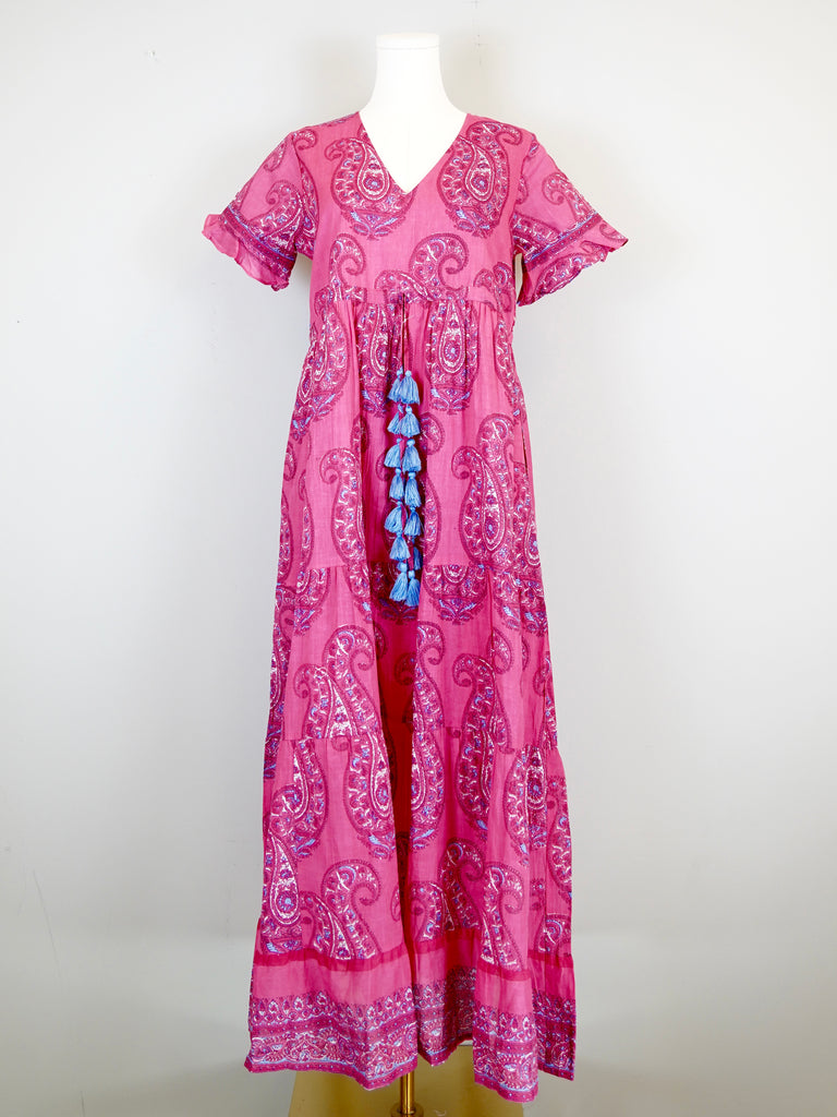 Such a lovely dress in beautiful colors! Active drawstring at empire waist with a cascade of blue tassels that accent the print. Short sleeves, v-neck, pockets. 100% cotton.