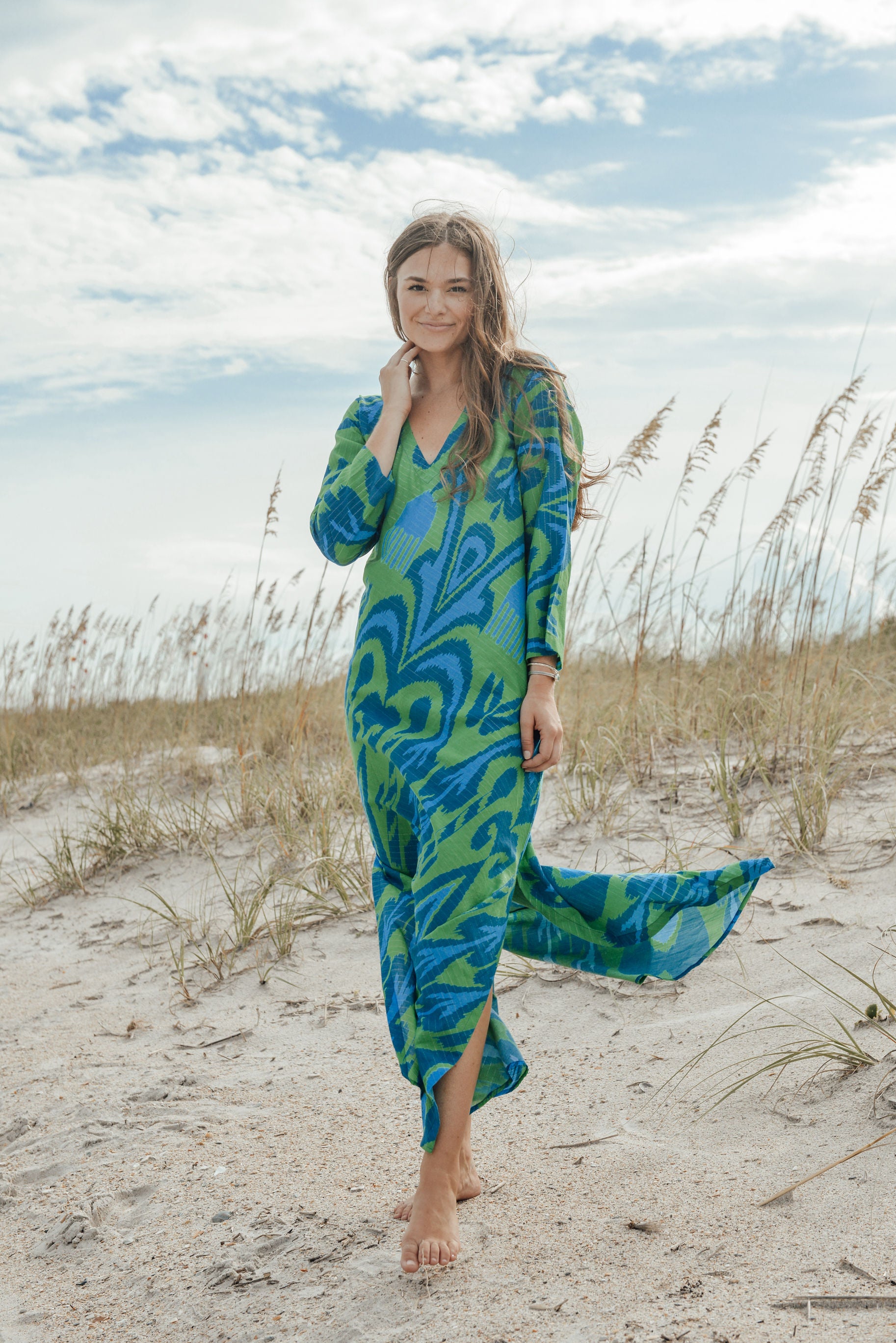 Grass green, dark green, turquoise and teal colors printed on 100% cotton. Maxi length dress. Ikat print.